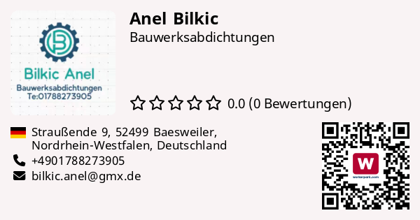 Mein Name ist Anel Bilkic,ich bin seit Juli 2024 Einzelunternehmer und nutze hiermit gerne die Möglichkeit mich bei euch vorzustellen.biete diverse qualitativ hochwertige Dienstleistungen an.durch meine 16 jährige Berufserfahrung als Dachdecker und meine Liebe zum Handwerk, habe ich mich auf Bauwerksabdichtungen spezialisiert. Sitz meines Unternehmens ist in Baesweiler.