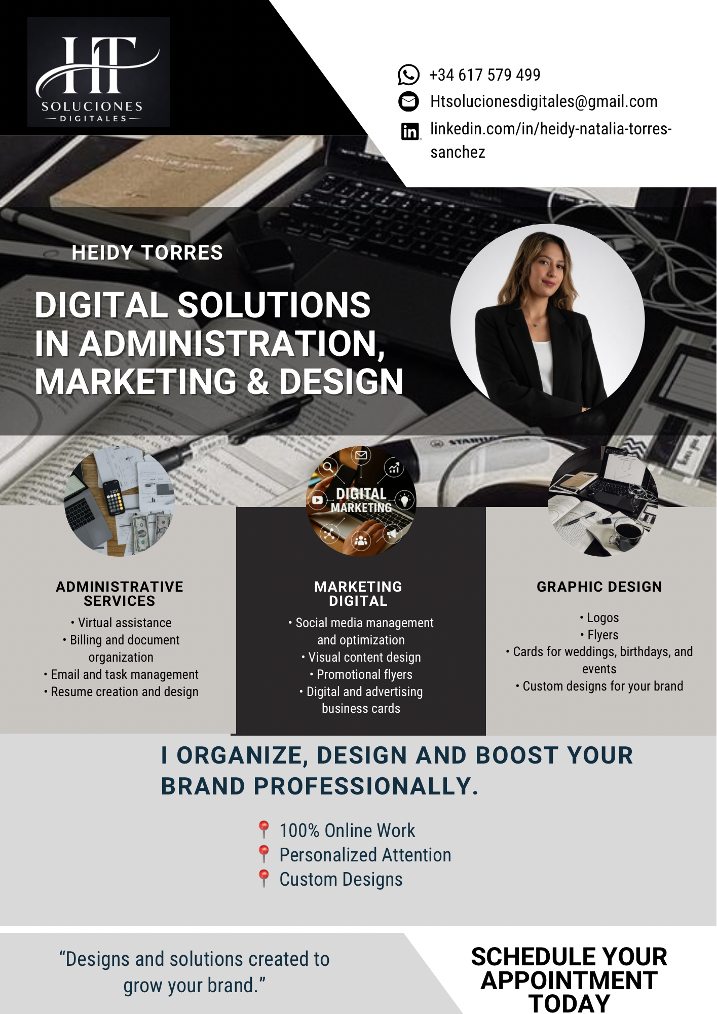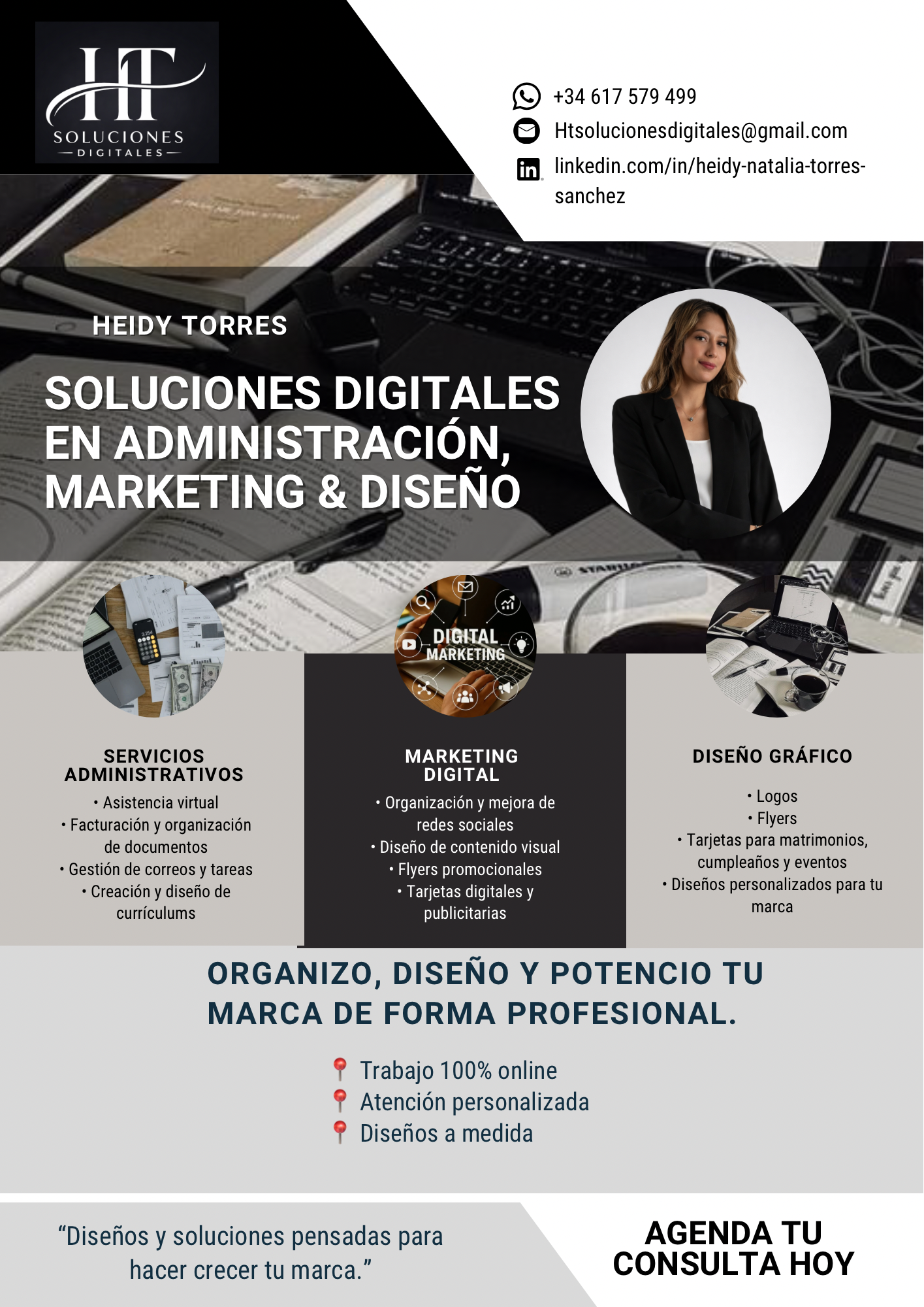 “Si eres emprendedor/a y te cuesta organizar tareas, redes o diseños, te ayudo a profesionalizar tu marca sin complicaciones. Trabajo 100% online y a tu medida. Escríbeme y vemos tu caso 👩💻✨”