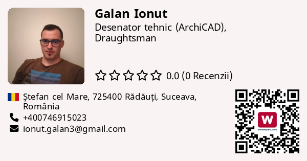 Salutare, numele meu este Galan Marius Ionuț. Sunt desenator tehnic din anul 2020, într-un atelier de arhitectură. Lucrez cu programul ArchiCAD. În decursul timpului, am desenat diverse tipuri de construcții, de la simple anexe, până la bloc S+P+3E în standard nZEB plus. Sunt serios, atent la detalii, rapiditate în execuția planșelor, self-learning, capacitatea de a lucra singur. Sunt în căutarea de noi provocări, colaborări tip remote. Dacă aveți nevoie de un desenator tehnic serios, sunt bucuros să vă ajut.