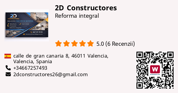🏗️ 2D Constructores En 2D Constructores somos una empresa especializada en reformas y construcción, comprometida con ofrecer resultados de alta calidad, acabados impecables y máxima satisfacción para nuestros clientes. Contamos con amplia experiencia en el sector y un equipo de profesionales cualificados que garantizan un trabajo eficiente, limpio y adaptado a cada necesidad. Nos encargamos de todo el proceso, desde la planificación hasta la entrega final, asegurando cumplimiento de plazos y presupuesto. 🔧 Nuestros servicios: • Albañilería • Fontanería • Electricidad • Reformas integrales de viviendas y locales Trabajamos tanto pequeñas reformas como proyectos integrales, siempre utilizando materiales de primera calidad y aplicando soluciones modernas, funcionales y duraderas. Nuestro objetivo es transformar cada espacio en un lugar cómodo, estético y funcional, cuidando cada detalle para superar las expectativas de nuestros clientes. 📍 Servicio profesional, seriedad y compromiso en cada proyecto. 📞 Solicita tu presupuesto sin compromiso.